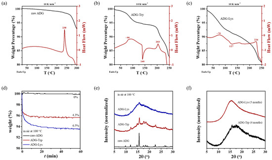 Figure 10. Thermal and storage stability of ADG-Trp and ADG-Lys. Differential scanning calorimetry–thermogravimetric analysis (DSC-TGA) curves of (a) raw ADG, (b) ADG-Trp, and (c) ADG-Lys; (d) macroscopic thermogravimetric analysis (macro-TGA) curves of raw ADG, ADG-Trp, and ADG-Lys in air at 100 °C; (e) PXRD patterns of raw ADG, ADG-Trp, and ADG-Lys after being heated at 100 °C for 1 h in air; (f) PXRD patterns of ADG-Trp after storage for 4 months and ADG-Lys after storage for 5 months in a sealed environment.