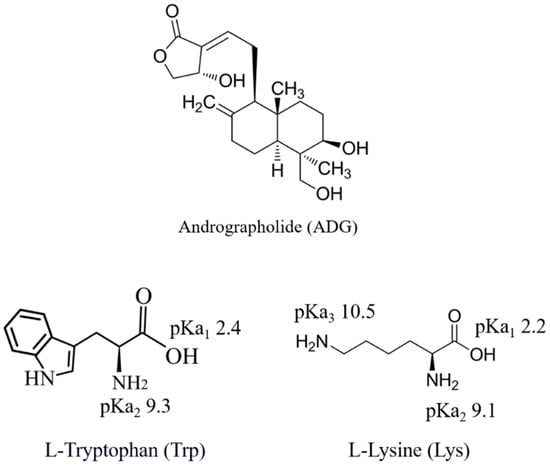 Scheme 1. Molecular structures of andrographolide (ADG), L-tryptophan (Trp), and L-lysine (Lys).