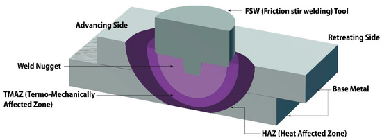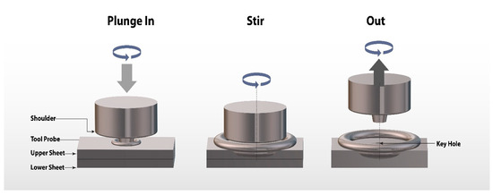 In recent years, FSSW has been commonly used in automobile, aviation, and aerospace fields, and a lot of industrial and commercial applications [6,7,8,9,10]. To maximize the application of FSSW and to minimize the defects, a different derivative of FSSW [11,12,13,14,15,16,17,18,19,20,21,22,23,24,25] such as refill FSSW is also being applied [26,27]. Though recent study shows that the joining of high-temperature similar and dissimilar alloys is possible through friction stir welding [10,11,12,13,14,15,16,17,18,19,20,21,22,23,24,25,26], the majority of FSW and FSSW is used for the lighter materials. Thinner plates joined by the fusion welds tends to become distorted, and therefore, makes it difficult to use. Tailor-made blanks are used in automatics to use lighter metal parts. Thinner plates of lightweight materials like aluminum can be joined very easily by the FSSW process, thus making FSSW a potential candidate for the automotive industries. Lighter material parts can help to reduce the overall weight of the motor vehicle and can increase fuel economy. In fact, unlike the fusion welds, FSSW is a clean and green weld without having any fumes or gases. Typically, there are three stages in a friction stir sport welding process: the plunge-in stage, stirring or welding stage, and lastly, the out stage. Figure 2 shows the different stages of the FSSP processes.