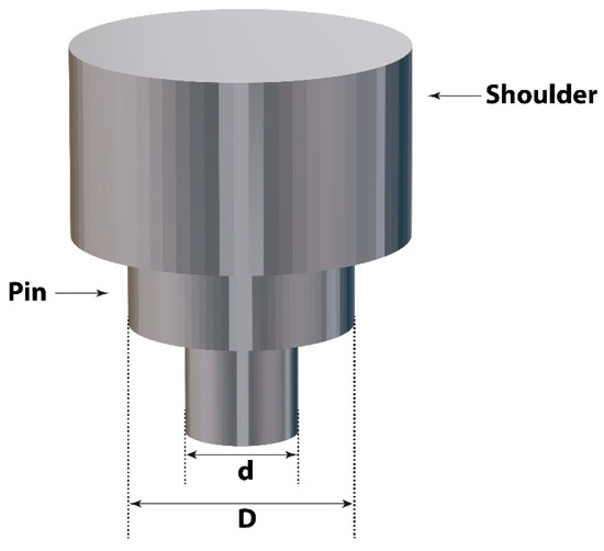 The best tool material for welding Al-Mg and low-carbon steel is steel, and to avoid excessive tool wear, the softer plate is placed on top of the steel plate for lap welds. In butt joint configuration, cold-worked X155CrMoV12-1 steel tool has been used for joining 99.5% pure Cu with CuZn30 brass with the help of friction stir spot welding [63]. Moreover, for successful welding of Al 6061 + 20% Al2O3 aluminum matrix composite and Al 359 + 20% SiC aluminum matrix composite, oil-hardened (62 HRC) tool steel has been used as a tool material [48,51]. Some investigations have shown that while performing FSSW on AMCs at first, the tool wear gets a self-optimized shape, but later on, it gets much less conspicuous [48,51,72]. But the increase in total wear has been observed with the increase in rotational speed [48,51]. Different types of materials such as stainless steel (SS), high-carbon high-chromium steel (HCHCr), high-speed steel (HSS), H13, and C40 have been used as tool material for tool steel to follow joining methods of friction welding [44,73,74]. Figure 4 shows the schematic diagram and photographs of the FSSW tools made of H13 and HCHCR-D2 tool materials.
