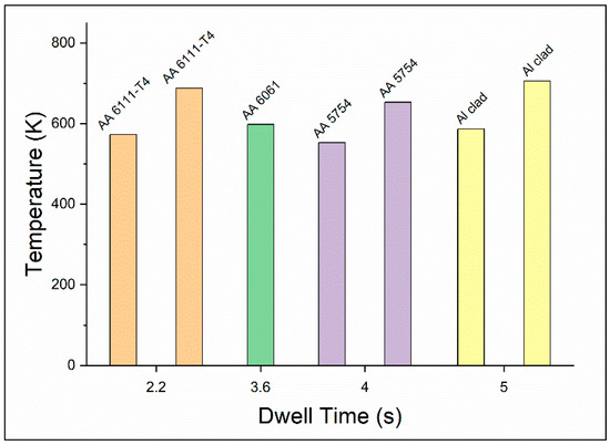 Figure 6 shows the compiled data of maximum temperature generated at different dwell times, whereas Figure 7 shows the variation of temperature at different speeds. Arul et al. [107] have used Al 6111-T4 sheets with a thickness of 1.3 mm and 1.7 mm as a welding sample and welded by using an H13 tool steel of 10 mm tool diameter. It can be observed that at a dwell time of 2.2 s, the maximum temperature rise was about 573 K at 1500 RPM, and at the same dwell time, at 3000 RPM, the temperature reached up to 688 K. The welding was performed in the Kawasaki SFW system, and the temperature was recorded by using a thermocouple, which was 2 mm away from the shoulder of the tool [107].