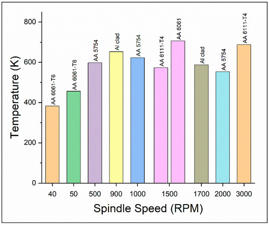 Also in a friction welding process, incipient melting may occur, since the shear strength of the plasticized metals tends to decrease significantly if the temperature reaches the solidus temperature. Thus, no further temperature rise takes place as a drop-in heat efficiency occurs in the process. The maximum temperature generated at different spindle speeds is shown in Figure 7. It was observed that the temperature changes with a change in spindle speed. Then, some fluctuation can also be observed until the temperature reaches its highest and then with the increasing RPM, the value of the temperature becomes more identical. From the plot, it can be concluded that the welding peak temperature remains between 523 K and 723 K. The lowest temperature was achieved at low spindle speed, i.e., 40 RPM and 50 RPM because of the low strain rate of the material.
