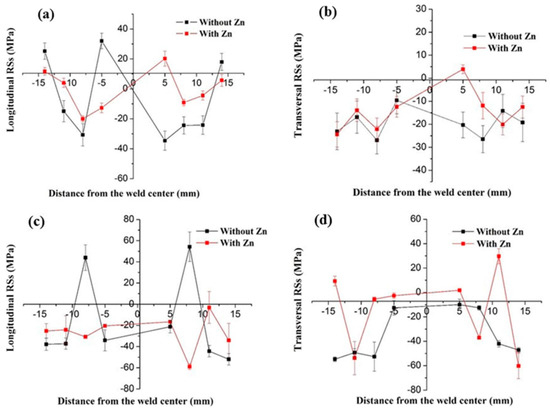 Residual stress distribution in Al−Cu dissimilar FSSW joint (a,c) Longitudinal, (b,d) Transverse for two different locations [122].