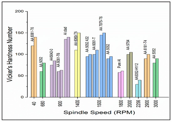 From the graph, it can be observed that four values of hardness were discussed for different Al alloys at 1500 RPM. These values are a compilation of experiments carried out by different authors, which are being discussed. Freeney et al. [129] carried an experiment with a 5052 H32 Al alloy of 1 mm and 1.6 mm thickness. The tool with a shoulder diameter of 12 mm, and a 1.77 mm long conical pin with a root diameter of 4.5 mm and a tip diameter of 3 mm was used for welding. At a rotational speed of 1500 RPM, the value of the hardness was in the range of 90–95 HV, and the hardness value decreased at a rotational speed of 3000 RPM in the range of 80–90 HV. The authors found that the factor affecting the HV values was dwelling time, but the only changes in the RPM do not make significant differences in HV values. It was also noted that at a speed of 680 RPM, the hardness value ranges between 60 and 80 HV. Aluminum alloy 6061 of 1 mm thickness was used by Pandey et al. [109] to conduct the study and found that the hardness was in the range of 100–110 near the edges of the Stir Zone at a spindle speed of 1500 RPM. The edges of the Stir Zone experience high material flow and due to the compression of more material at those points, the hardness values are usually higher. Another study by Badarinarayan et al. [119] was conducted by using Annealed 5083 Al sheets with two different thicknesses at a spindle speed value of 95–100 HV with an RPM of 1500. This alloy had a higher hardness value in the SZ than the BM and with a distance of around 2 mm from the periphery of the weld keyhole, the HV values were lower and quite stable at the same time. Shen et al. [130] experimented with a 7075-T6 aluminum alloy plate of 2.0 mm thickness. The hardness values of the same experiment range between 145 and 150 in the SZ area at 1500 RPM. The HV distribution was W-shaped and the lowest hardness values were obtained at the boundaries of the HAZ and TMAZ. The factor affecting the HV values was dwelling time, but the only change in spindle speed does not make significant changes in HV values. Freeney et al. [129] selected strained hardened 5052 H32 aluminum alloy to conduct their study. The next bar represents the HV value of the same study which ranges from 90–95 at the boundaries of the SZ, at a spindle speed of 1500 RPM.