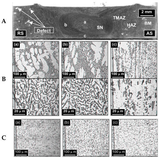(A) Cross section of the FSW joint; (B) micrographs of (a) BM, (b) HAZ, (c) TMAZ; (C) micrograph of the (a–c) marked regions of the Stir Nugget Zone [133].