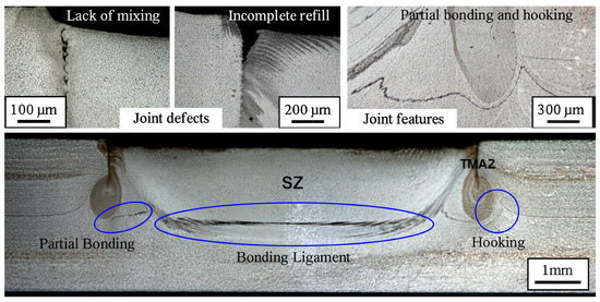 Macrographs of a typical FSpW connection cross section showing the weld zones, geometric/metallurgical features, and weld defects [132].