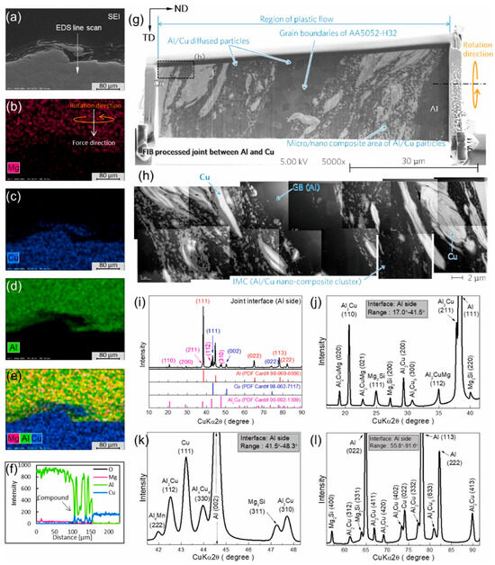 EDS images of Al-Cu joint: (a) joint interface (b–e), mapping of Mg, Cu, Al, and Mg-Cu-Al, (f) line scan of Al-Cu joint interface, (g) magnified joint interface, (h) various locations of the joint interface using HAADF-STEM, (i–l) XRD of the joint interface at various angles [121].