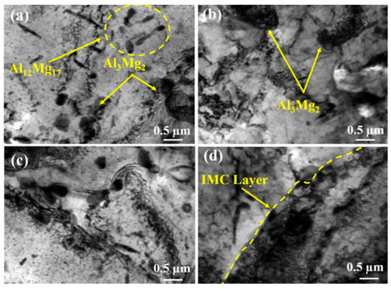 TEM images of Stir Zone (AZ91D and Al-7Si) at different tool rotational speeds (a) 700, (b) 800, (c) 900, and (d) 1000 rpm [25].