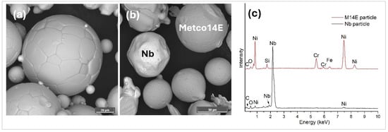 Morphology of the Nb powder prior to mixing (a), NiCrBSiNb mixed powder (b), and EDX microanalysis of individual NiCr-Nb powder particles (c).