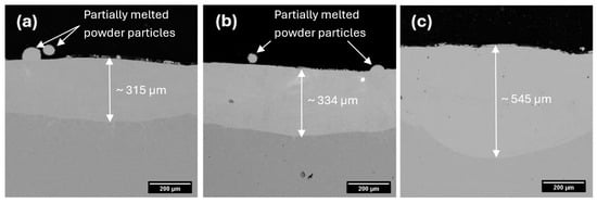 The effect of laser power on the NiCrBSi-Nb coatings was investigated by using SEM and a back-scattered (BSE) combo detector. The cross-sectional views of the samples are presented in Figure 2 at 500× magnification. As shown, the coatings are metallurgically bonded to the substrate without major defects, such as pores or cracks. Samples 1 and 2 show partially melted particles sticking on both sample surfaces probably due to insufficient laser energy. Similar observations have been reported by Wang et al. [25]. Furthermore, Pal et al. [26] concluded that the quantity of adherent powder particles on the surface decreases with increasing laser power and scanning speed. In the present case, the scanning speed is a parameter that was kept constant. Using lower laser power, fewer particles absorb enough energy to reach their melting point, resulting in less melted feedstock powder and thinner coatings being deposited. Another reason might be that not all powder particles fall directly into the center of the laser beam; thus, they are partially melted and projected in various directions. As shown in Figure 2, the coating thickness increases as laser power rises from 2800 W to 3200 W. With an input of less than 3000 W, a smaller melt pool was generated, resulting in a thinner coating of approximately 315 µm for Sample 1. The intermediate sample, deposited at 3000 W, was approximately 6% thicker (~334 µm) than Sample 1, while Sample 3 (~545 µm) was around 73% thicker than Sample 1. This is because higher laser power creates a larger and deeper melt pool, resulting in increased coating thickness and more extensive melting of the substrate [27]. This indicates that the laser power has a strong influence on the penetration depth, which is affected by the capacity of the feedstock material to absorb the laser’s thermal energy.