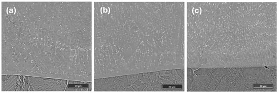 Planar and cellular crystals characterize the microstructure present at the coating–substrate interface in all samples, with similar structures reported by Qian et al. [28]. This is a common feature of laser-clad coatings and is caused by the high thermal gradient encountered during the solidification process. The planar crystals grow on the flat interface and form a grey band above the substrate, as can be seen in Figure 3 and as has been described by Wang et al. [25]. As the temperature decreased during solidification, cellular crystals formed next to the planar crystals with preferred orientation, resulting in the growth of coarse columnar crystals, which are tilted along the heat flow direction [29]. Changes in the ratio of the temperature gradient (G) to the growth rate (R) influence the solidification mode, which influence the microstructure and grain size. Planar crystals are formed at a high G/R ratio, whereas cellular crystals develop at lower G/R ratios. As can be seen in Figure 3, the coarser grains dominate at the interface in Sample 1, and grain refinement occurs in Sample 3 as the power increases.