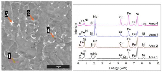 To evaluate the microstructure of the layers, the distribution of the main elements, including Ni, Cr, Fe, Si, C, and Nb, in the areas of interest was analyzed using EDX point scanning. As the composition of the layers was similar, only the microstructure and EDX results for Sample 1 are presented. Five major areas were identified within the samples according to the microstructure and EDX investigations, as shown in Figure 6. The main phase, labelled Area 1, is the main gamma phase. As the coatings solidify, they form a γ-[Ni, Cr, Fe] solid solution as the matrix. Since Area 2 is rich in Fe and Ni, it is considered to be NiFe eutectic enriched in Nb. The white, blocky, cross-shaped particles labelled Area 3 are enriched in Nb and C, so according to the EDX spectra, they are more likely to correspond to NbC. Moreover, the atomic number of Nb is the highest among the investigated elements, and it appears brighter in the BSD micrograph. Analysis of the dark-colored precipitates labelled Area 4 shows that they are rich in Cr, Fe, and C, indicating that they are complex carbides, such as (Cr, Fe)23C6. Although B was present in low amounts in the feedstock powder composition, it was not detected by point scanning due to the limited sensitivity of EDX to light elements.