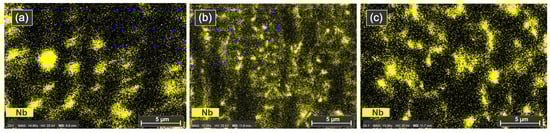Figure 7 shows that the Nb-rich areas are located not only in the matrix, but also at grain boundaries. As the laser power increased, the NbC transformed from blocky, cross-shaped particles to fine particles that were more evenly distributed at the fine-grain boundaries and triple junctions in Sample 3 (see Figure 7c). The formation of NbC is of interest since it possesses an increased hardness, elevated melting point, and high elastic modulus [35]. It can also be observed that Nb enriched the surrounding area of carbides through its dissolution within the solid solution matrix.