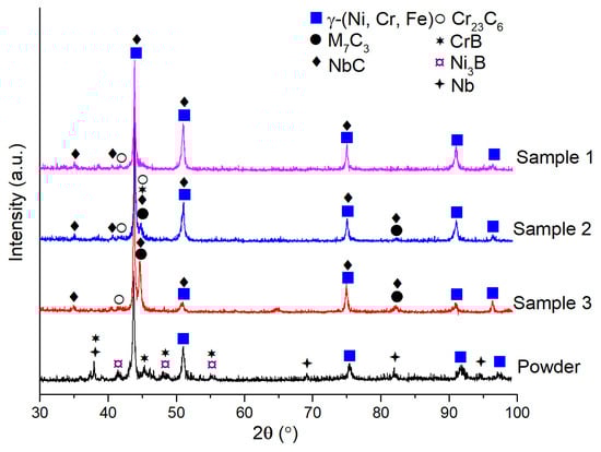 X-ray diffraction (XRD) analysis was conducted to investigate the phase composition of the NiCrBSiNb powder and cladding layers, with the results presented in Figure 8. The γ-[Ni, Cr, Fe] phase was identified as the primary phase within the coatings. Various carbides and borides, such as M7C3, Cr23C6, NbC, and CrB, were also detected, in addition to this primary phase. Similar findings were reported by Huang et al. when investigating NiCrBSi coatings deposited via laser induction cladding [36]. Increasing the laser power was found to lead to a slight increase in the number of carbides in Samples 2 and 3 compared to the feedstock powder and Sample 1. Furthermore, the volume fraction of M7C3, Cr23C6, NbC, and CrB, identified at the 2θ peak at about 49°, increased with the laser power employed during cladding. The absence of broad halo peaks indicates that no amorphous structures were detected.