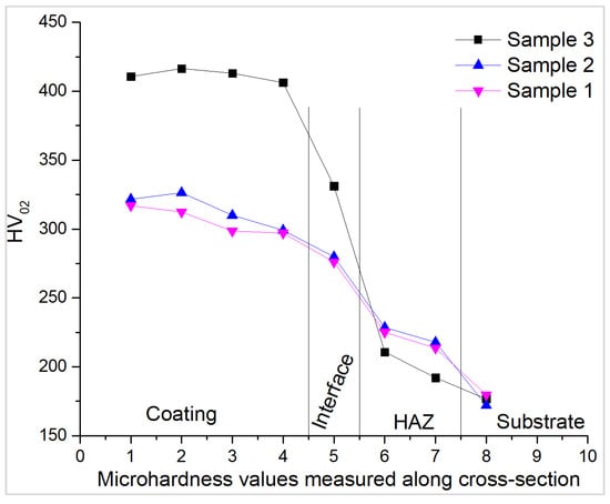 Microhardness was measured across the cladded coatings, from the surface down to the substrate, and the results are presented in Figure 9. In all coatings, the hardness is high at the top of the coating and decreases towards the substrate. Sample 3 has a significantly higher hardness, through the dispersion of carbides at grain boundaries, lower Fe content, and grain refinement, thus improving the mechanical properties due to the Hall–Petch effect. In general, hardness increases as laser power increases. As the laser energy increases, so does dilution, resulting in better wetting of the substrate and spreading of the feedstock material, but this leads to decreased carbide content [37]. However, this does not appear to be the case in the present study. The lower energy input, combined with the same powder feed rate and scanning speed, appears to be insufficient to melt the powder completely. Consequently, more of the laser energy is absorbed by the substrate than by the powder, leading to lower hardness due to the Fe content from the substrate. In contrast, Sample 3 appears to require an increased laser power of 3200 W, applied using a pulsed laser system, for more efficient cladded layers. This higher power enables the powder to melt more efficiently. This results in more of the laser energy being absorbed, leading to the formation of a greater volume of precipitates and secondary phases that enhance the performance of the coatings. The hardness of the heat-affected zone (HAZ) in Samples 1 and 2 is somewhat higher compared to the HAZ in Sample 3. This increase is likely due to metallurgical changes resulting from rapid heating and cooling, which are strongly influenced by the laser beam interacting with less powder during the cladding process. At 2800–3000 W, the powder feed rate is high in relation to the laser energy input, and the beam cannot melt all of the incoming powder. This decreases cladding efficiency, leading to thinner, lower-quality coatings with unmelted particles on the surface. When using other types of laser processes, this could also increase porosity. Thus, a higher laser power ensures more complete melting of the powder particles [38]. Another possible explanation is the intergranular diffusion of the γ-[Ni, Cr, Fe] phase along grain boundaries, as observed in the microstructural analysis of Sample 1.
