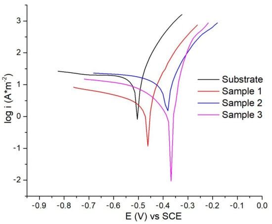 The polarization curves were recorded for all the tested samples, and the results are presented in Figure 10. In all cases, the coatings demonstrated improved corrosion resistance compared to the low-carbon substrate. The results indicate that Sample 3 exhibited better corrosion resistance compared to Samples 1 and 2. The shift of the polarization curve toward lower current densities suggests that the increased coating thickness has enhanced corrosion resistance.