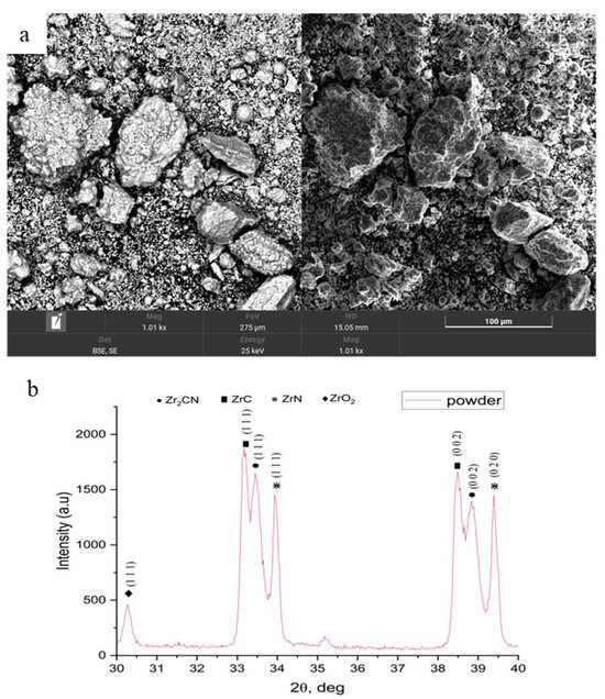 Zirconium carbide (ZrC) and zirconium nitride (ZrN) powders were purchased from Hebei Suoyi New Material Technology Co., Ltd. (Handan, China). The zirconium carbonitride (ZrCN) powder was synthesized in-house in accordance with the applicable Technical Specifications (TU). The surface morphology of the powders is shown in Figure 1a. The powders exhibit an irregular polyhedral fragmented morphology, which is known to be less flowable than spherical particles. Particle size analysis revealed sizes ranging from 10 to 100 μm, with the following parameters: d10 = 15 μm, d50 = 45 μm, and d90 = 85 μm. Figure 1b shows the X-ray diffraction (XRD) pattern of the initial ZrCN powder selected for spraying. The presence of a ZrCN peak alongside those of ZrC and ZrN indicates partial retention of the original zirconium carbonitride [26], as well as its decomposition into zirconium nitride. At the same time, the main diffraction lines of this phase correspond in position to the shifted peaks of (ZrC) and (ZrN)-type phases with cubic lattice parameters.