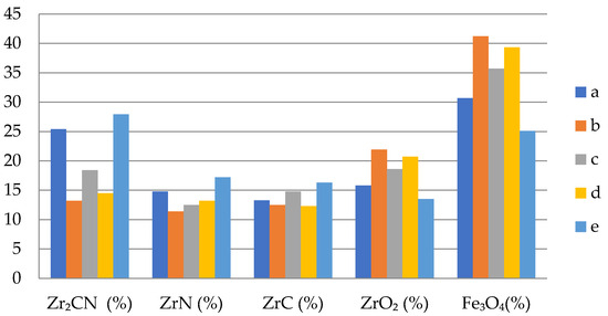 To further evaluate the phase composition of the coatings, quantitative X-ray phase analysis was conducted using the Rietveld refinement method. The results are summarized in Table 3 and visualized in the bar chart (Figure 2) for five samples (Samples a–e) obtained under different spraying conditions. The highest content of the Zr2CN phase was observed in Sample e (27.9%), indicating the most effective stabilization of the original carbonitride phase under these conditions. Sample a also showed a relatively high Zr2CN content (25.4%), whereas Samples b and d exhibited the lowest concentrations (13.2% and 14.5%, respectively).