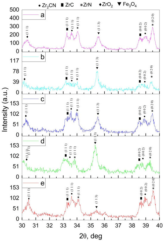 The maximum content of ZrN was found in Sample e (17.2%), and ZrC was also highest in this sample (16.3%), suggesting partial decomposition of the initial Zr2CN phase and redistribution of its constituents. The oxide phase ZrO2, ranged from 13.5% (Sample e) to 21.9% (Sample b), likely reflecting differences in oxidation levels of zirconium-containing phases due to variations in air pressure and thermal input during spraying. The iron phase (Fe), originating from the steel substrate, constituted a substantial portion of the total phase composition, ranging from 25.1% (Sample e) to 41.2% (Sample b).