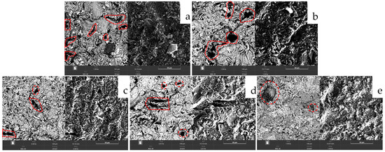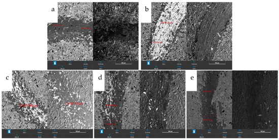 Additionally, SEM images of wear tracks on the coating surfaces are presented in Figure 6. The analysis of the wear zone morphology revealed a clearly defined worn area ranging from 329 to 759 µm in width, exhibiting characteristic parallel grooves indicative of an abrasive wear mechanism. WI spans approximately 0.16–1.90 mm3/(N·m). An increase in the wear track area corresponds to a decrease in wear resistance. Microstructural analysis of the worn surfaces provides direct evidence of differences in the wear mechanisms among Samples a–e.