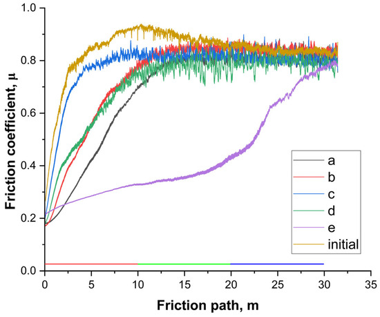 Typically, wear-resistant coatings are designed to minimize the running-in period and ensure stable performance with low fluctuations. Variations in behavior may result from interfacial delamination between the coatings, as well as from surface preparation procedures, including cleaning or roughening. For accurate analysis of the tribological behavior, the process was divided into three stages: Stage 1—the initial phase up to 10 m (marked in red), Stage 2—the intermediate phase from 10 to 20 m (marked in green), and Stage 3—the final phase from 20 to 30 m (marked in blue).