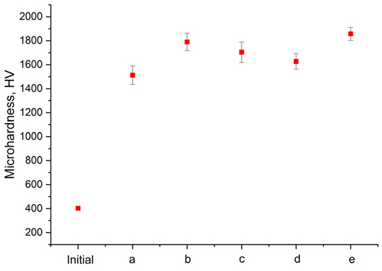 Overall, the combined analysis of XRD patterns (Figure 2) and quantitative phase distribution (Figure 3) confirmed that the phase composition of the coatings is highly sensitive to the deposition parameters. Sample e demonstrated the most balanced content of the carbonitride matrix and the lowest concentrations of oxides and iron, indicating formation under near-optimal spraying conditions.