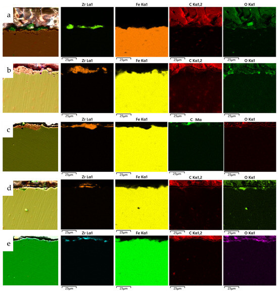 Mapping the distribution of chemical elements on cross-sections of ZrCN coatings Sample (a–e).