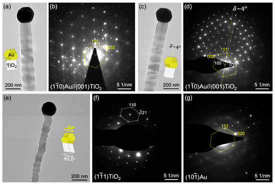 Figure 3 illustrates a TiO2 nanowire exhibiting ORg2 with its Au seed. ORg2 is defined by the alignment of and , where reflections overlap with reflections when viewed along . The bead-like morphology of the nanowires is clearly viewed in the BF micrograph in Figure 3a acquired along . Within the accessible tilting range of the TEM, the low-indexed directions, and , are related by a 15° rotation about the best lattice-matched direction pair of . Viewed along , Figure 3b–d show the SAED pattern of TiO2, the convergent-beam electron diffraction (CBED) pattern of TiO2, and the CBED pattern of Au, respectively. The Kikuchi lines, corresponding to and , labeled by the white lines in Figure 3c,d, are parallel, confirming the alignment of their normal, the best lattice-matched direction pair, . Similarly, when viewed along , Figure 3e–g present the SAED of Au, the CBED of TiO2, and the CBED of Au. The above two viewing directions are reached by tilting the specimen approximately 0.5° in and 15° in , where and are the tilting axes of the TEM holder. After rotating back by 15° from around the axis, the Au seed is identified as having , indicating that is nearly parallel to . Therefore, this nanowire is consistent with ORg2 having ~3.43 out-of-plane rotation.