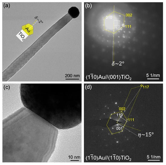 Figure 2 presents typical examples of Au-seeded TiO2 nanowires exhibiting ORe2. ORe1–2 is defined by the alignment of and , where reflections overlap with reflections when viewed along . The nanowire shown in Figure 2a slightly deviates from the ideal ORe2, as evidenced by a ~2° offset between and reflections in the corresponding SAED pattern in Figure 2b. This offset indicates a small out-of-plane deviation of ~2° around . Figure 2c,d shows the high-resolution TEM micrograph and overlapped SAED pattern acquired with the electron beam aligned along . Figure 2d indicates a nearly parallel alignment of , characteristic of the ORe2 (i.e., ). suggests a significant deviation of ~15° from the ideal direction pair, .