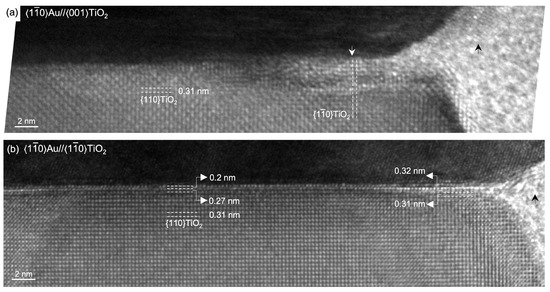HRTEM micrographs of Au–TiO2 interfaces. (a). ORa interface viewed along ; (b). ORe2 interface viewed along . is highlighted by white lines, with its corresponding interplanar spacings indicated along the white arrows. The black arrows denote TiOx layers near the seed–nanowire–vapor triple lines.
