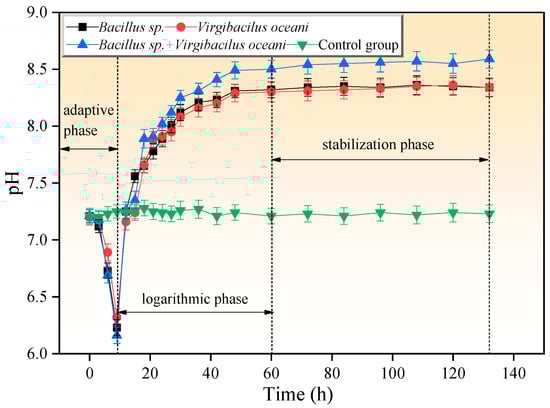 Several experimental groups were set up in this experiment, including the experimental group inoculated with microorganisms of Bacillus sp., the experimental group inoculated with Virgibacilus oceani, the experimental group co-precipitated by Bacillus sp. and Virgibacilus oceani, and the blank control group as a baseline for the comparison of the experiments, with an experimental period of 2 days. The experimental period was 6 days for the corresponding experimental and control groups. During the experiment, the supernatant of the solution was collected periodically, and the change in pH value was observed and recorded.