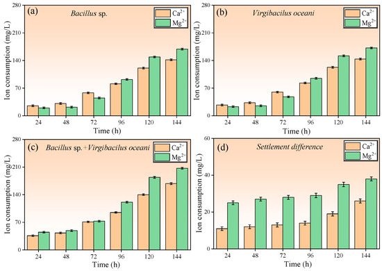 Consumption of Ca2+ and Mg2+ in different systems. (a) The consumption of Ca2+ and Mg2+ in Bacillus sp. system; (b) the consumption of Ca2+ and Mg2+ in Virgibacilus oceani system; (c) the consumption of Ca2+ and Mg2+ in the coexistence of Bacillus sp. and Virgibacilus oceani systems; (d) the settlement difference in the consumption of Ca2+ and Mg2+.
