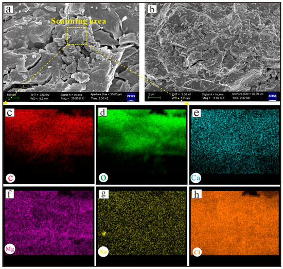 To investigate the type of microbial-induced mineral precipitation and the morphology in more depth, the precipitates in the control group were collected and observed using SEM, and the relative abundance distribution of the elements in space was mapped by scanning the two-dimensional area of the sample surface or cross-section by EDS. As shown by the results in Figure 3, no precipitates representing the formation of new minerals appeared in the control group, and no significant mineral precipitation reactions were observed to occur. The main substances present in the image were the various components of the medium (Figure 3a,b). Elemental components were clearly evidenced by the distribution of C, O, Ca, Mg, Na, and Cl elements (Figure 3c–h).