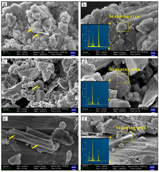 The morphology of the precipitates in the systems of different experimental groups is shown in Figure 4. Among the observations for the Bacillus sp. experimental group, it was found that the minerals generated in the SEM images exhibited diverse sizes and morphologies. Rod-shaped, ellipsoidal minerals can be observed, as well as aggregates composed of cauliflower-shaped particles arranged in close proximity (Figure 4a,b). Aggregates composed of cauliflower-shaped particles had a diameter of only about 50 nm, whereas individual rod and ellipsoidal mineral particles were relatively large, with diameters ranging from 100 to 200 nm. EDS spectroscopic analysis of these minerals showed elemental compositions containing C (16.9%), O (23.8%), Ca (46.3%), Mg (2.5%), P (7.6%), and S (2.9%). The results indicated that those individual spherical particles were mainly composed of calcium magnesium carbonate (proto-dolomite). The presence of the organic elements P and S suggested a close relationship between microorganisms and mineral formation. In addition, Na and Cl elements may be consumed through several pathways during biomineralization. For example, they may participate in metabolism as cofactors for enzymes (such as carbonic anhydrase) or compete with Ca2+ for adsorption sites through ion exchange. Therefore, they were not detected due to their low content in the experimental groups.