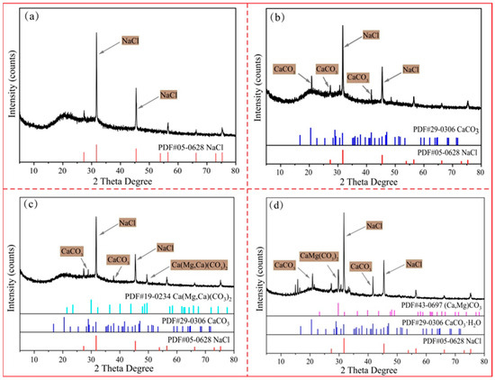 XRD analyses of minerals: (a) control group; (b) Bacillus sp. system; (c) Virgibacilus oceani system; (d) the coexistence of Bacillus sp. and Virgibacilus oceani systems.