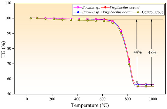The results of thermal analysis of the precipitated minerals in different systems at a heating rate of 10 °C/min are shown in Figure 6. The results of the TG curves indicated that the ratio of mass loss in the control group amounted to 48%, and the ratio of residual mass was 52%. However, the mass loss ratio of minerals in different experimental groups was smaller than that of the control group, especially for the co-precipitation system of Bacillus sp. and Virgibacilus oceani, where the mass loss ratio of minerals was 44% and the remaining mass ratio was 56%.