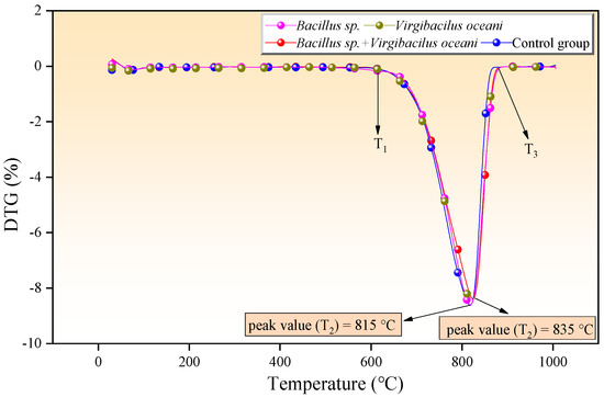 The DTG curves of the precipitated minerals in different systems at a 10 °C/min heating rate are shown in Figure 7. The results showed that the whole thermochemical decomposition process can be roughly divided into three stages. Among them, the first stage occurred at the initial setting temperature of 50 °C to T1. The second stage occurred from T1 to T3, and the second stage, in which weight loss of minerals occurred, was mainly due to the mass loss caused by the thermal decomposition. Meanwhile, at the temperature point of T2, the slope of the curve can be found to reach the maximum value from the TG curve, which represents the fastest rate of weight loss of the sample. In addition, the maximum thermal decomposition temperature of the minerals in the control group reached 815 °C, and the maximum thermal decomposition temperature of the minerals in the co-precipitation system reached 835 °C. The third stage occurred from T3 to 1000 °C, and at this stage, the quality of the minerals basically no longer changed and had stabilized. The results fully illustrate that the thermal stability and crystallinity of biogenic minerals were higher than those of inorganic minerals [44].
