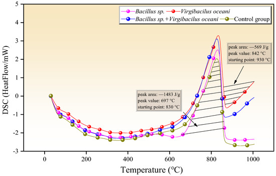 The results of heat flow change (ΔH) of precipitated minerals in different systems are shown in Figure 8. The peak area of the DSC curve was usually utilized to express the change in heat flow of the substance, i.e., the ΔH value. The results indicated that the ΔH value in the control group was 1246 J/g, which was lower than the ΔH value of 1483 J/g in the Bacillus sp. and 1663 J/g in the co-precipitation system. The peak area in the third stage appeared only in the Virgibacilus oceani and co-precipitation systems, which indicated that the heat flow changes occurred in this stage, which were 569 and 758 J/g, respectively.