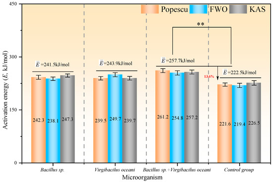 The results in Figure 9 show that the E values of minerals in the control group were 221.6, 219.4, and 226.5 kJ/mol, with an average value of 222.5 kJ/mol, which were lower than those of the experimental group, which were 241.5, 243.9, and 257.7 kJ/mol, respectively. In addition, the correlation fitting coefficients (R) were all over 0.90, which indicated that the selected methods could better reflect the kinetic parameters of the minerals. In summary, the results of thermal analysis showed that the activation energy of biogenic minerals was higher than that of the control group, and their thermal stability was higher. Double asterisks represent p < 0.01 in Figure 9, indicating the results have statistical significance.