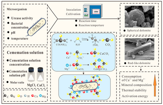 In addition, microbial metabolic processes, which have a significant effect on the adjacent water chemistry conditions, may form microenvironments that are favorable for dolomite precipitation, thus promoting dolomite nucleation. For example, organic matter is utilized by microorganisms as an electron donor, reducing sulfate ions (SO42−) to hydrogen sulfide (H2S). At the same time, alkaline substances and carbon dioxide (CO2) are released. This reaction produces a large amount of bicarbonate ions (HCO3−) and is accompanied by a local increase in the pH value. When microbial metabolism increases the environmental pH to above 8.5, the ionization equilibrium significantly increases, leading to a substantial rise in the CO32− concentration [19,20]. Microbial metabolic activity is used by MICP technology to bind loose sand particles into a solidified layer, significantly enhancing soil resistance to wind erosion and rainwater erosion, thereby effectively suppressing the occurrence of dust storms. For example, in a large-scale field trial in the Tengger Desert of Ningxia, MICP technology was applied to a 50,000 m2 windbreak area, successfully forming a stable solidified layer on the sand surface, replacing traditional ineffective facilities such as grass grid barriers. Additionally, the combined application of this technology with xerophytic plants further enhances windbreak and sand fixation effects [21]. According to the difference in microbial metabolism, there are four main categories: aerobic heterotrophy, chemotrophic sulfide oxidation, dissimilatory sulfate reduction, and methanogenesis coupled to anaerobic oxidation of methane. Overall, the bio-dolomite model involves an increasing diversity of microbial motility (both benthic and planktonic microbes) and metabolic types (both aerobic and anaerobic) [22].