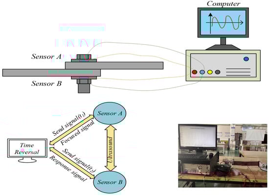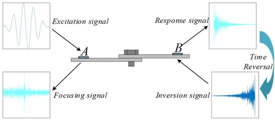 The TR algorithm is a mathematical technique that was first proposed in 1965 [62]. Later, Fink [56,57] and other scholars introduced the concepts of the time-reversal mirror and the time-reversal cavity. In simple terms, time-reversal technology refers to the process of performing a temporal inversion of the received signal, that is, reversing the order of the signal in time. In the frequency domain, this operation is equivalent to performing a phase conjugation. The time-reversal algorithm has been widely applied in the field of structural health monitoring. In this study, the same method is employed, with its fundamental principle outlined as follows: when dealing with complex propagation paths and environmental noise interference in practical engineering applications, the time-reversal method can effectively achieve adaptive signal-energy focusing and significantly improve the signal-to-noise ratio (SNR). Based on these advantages, this work utilizes the time-reversal algorithm to design the monitoring experiments.