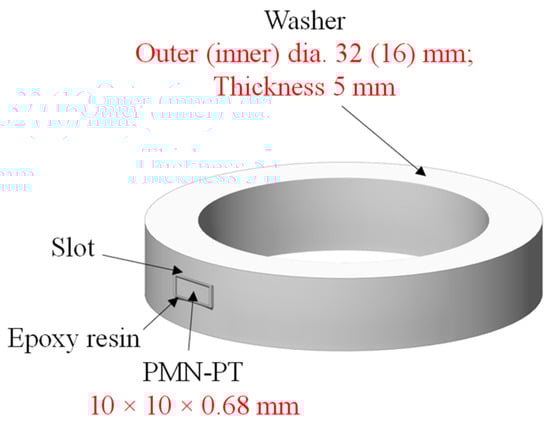 Schematic diagram of the smart washer showing nominal PMN-PT wafer dimensions (10 × 10 × 0.68 mm) and horizontal insertion into a tangential side slot. The embedded radial extent is ≤ 8 mm, consistent with the washer’s geometry (OD 32 mm, ID 16 mm, thickness 5 mm).