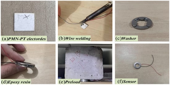 The sensor (smart washer) consists of a PMN-PT wafer, a monolithic washer, an epoxy resin layer, and shielded wiring. As shown in Figure 2, the monolithic washer, manufactured by Dongguan Endun, has an outer diameter of 32 mm, an inner diameter of 16 mm, and a thickness (height) of 5 mm. The core sensing element is a PMN-PT wafer measuring 10 mm × 10 mm × 0.68 mm, poled along its thickness direction. Silver electrodes were deposited on both surfaces using spray coating to ensure optimal sensing performance. For embedding, the wafer is inserted horizontally into a machined tangential slot on the washer’s circumference. In this arrangement, the 0.68 mm thickness spans the washer’s 5 mm thickness, while the wafer’s embedded radial extent (≤8 mm) fits within the washer’s ring width (32 − 16 = 16 mm, i.e., 8 mm per side). Slight edge trimming and epoxy encapsulation provide clearance and protection against brittle fracture under torque. Silver electrodes were deposited on both wafer surfaces via spray coating, with electrical leads bonded to the top and bottom. The wafer was then precisely placed into the washer slot, and interfacial gaps were filled with K-9741 epoxy resin (Guangdong Hengda New Materials Co., Ltd., Zhuhai, China). Controlled preloading was applied prior to a 24 h curing process in a dry, ventilated environment to ensure uniform epoxy encapsulation. Key material properties of the washer and epoxy are provided in Table 3 and Table 4, respectively. Figure 2 shows the schematic geometry, while Figure 3 illustrates the complete assembly process with a real-view photograph.