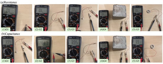 Elvin et al. [64] reported that the capacitance value of piezoelectric elements changes significantly when embedded in a substrate after welding. To evaluate the waterproofness and electrical performance of the sensor, different working conditions were established, and the resistance and capacitance of the PMN-PT sheet were measured for the first time, recorded as condition G1. Epoxy resin was evenly applied around the welded PMN-PT material, then left for one hour to cure, recorded as condition G2. The sensor was immersed in a glass of water and stirred with a glass rod for 15 min, recorded as condition G3. The finished sensor was pre-pressurized for 24 h and marked as condition G4. The assembled smart washer sensor was then recorded as condition G5. The resistance and capacitance values are shown in Figure 4, with measurements summarized in Table 5 and Table 6.