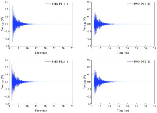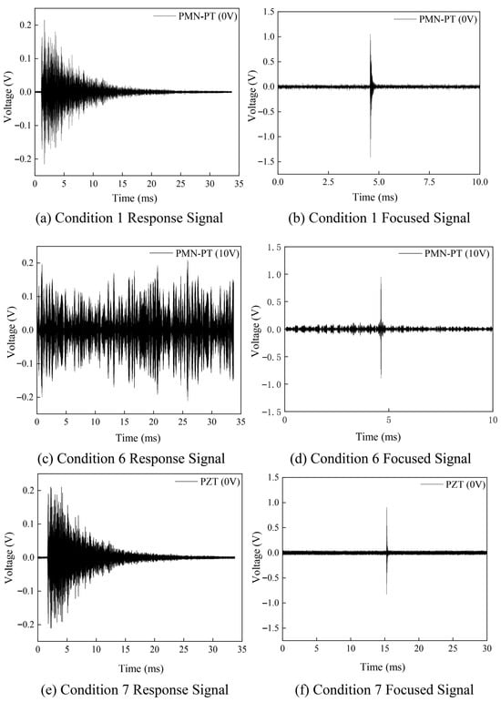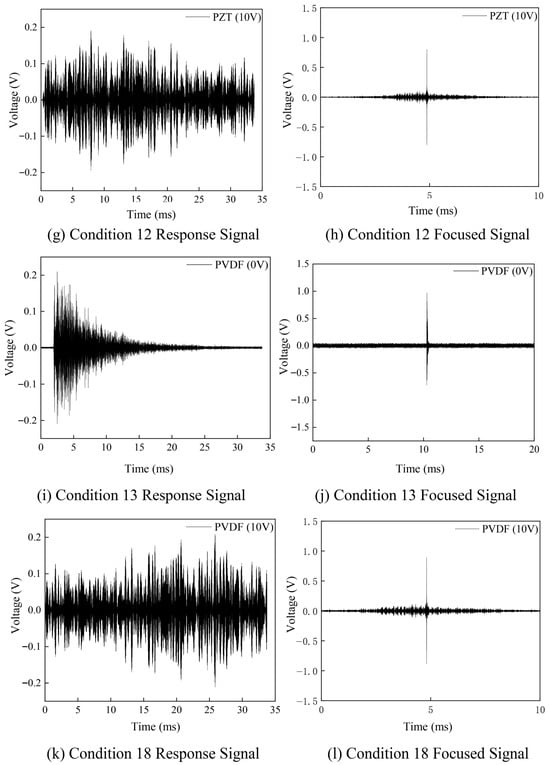 By adjusting the Gaussian white noise signal amplitude to represent different conditions, the signal received by PMN-PT2 at Condition 1 was considered the response signal. The response signal was processed using MATLAB’s time-reversal method, then re-excited by PMN-PT2 and received by PMN-PT1 to obtain the focused signal. The same procedure was repeated for PZT and PVDF materials. The summarized results for the conditions are shown in Table 8. The experimental results are presented in Figure 10a–l.