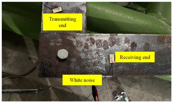 The required hardware and software for the experiment include a data acquisition system with a MATLAB version R2023a-integrated PCI-2 card, charge amplifier, torque wrench, two steel plates, and high-strength bolts (Model M14). The maximum applied torque is 120 N·m, assuming the bolt is fully tightened at 120 N·m. The charge amplifier amplifies the signal by a factor of 40. A sine wave with a central frequency of 150 kHz is excited by PMN-PT1, modulated by a Hanning window, with a maximum amplitude of 5 V. Additionally, PMN-PT3 excites a Gaussian white noise signal to simulate environmental noise. The on-site experimental setup is shown in Figure 9.