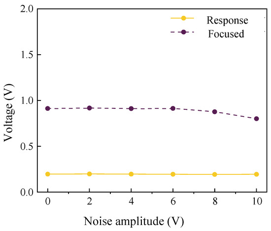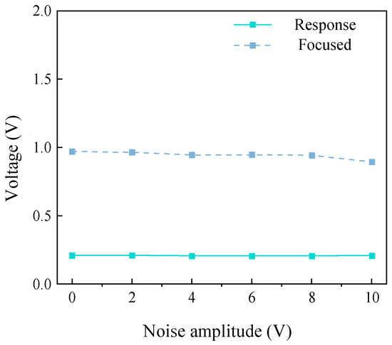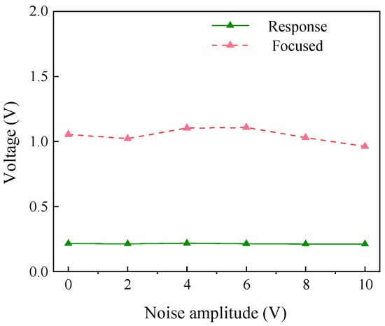 According to the results shown in Figure 11, Figure 12 and Figure 13, it can be observed that as the noise amplitude increases, the response signals for all three piezoelectric materials slightly decrease, but the change is not significant. This is because the noise primarily affects the overall peak value of the signal. Overall, the peak value of the PMN-PT response signal is consistently greater than that of the focused signal, directly attributable to its good SNR and high piezoelectric coefficient. The peak values of the focused signals for all three materials show a decreasing trend as environmental noise increases, with PMN-PT still outperforming the other two materials. The focused signal for PMN-PT increases by an average of approximately 4.89 times compared to the response signal. The focused signal for PZT increases by an average of approximately 4.58 times compared to the response signal. The focused signal for PVDF increases by an average of 4.51 times compared to the response signal. This difference in response and focused signal peaks can be attributed to the fact that the initial response signal peak for PMN-PT is higher than that of the other two materials. During the second excitation, when the ultrasonic signal is received, the higher piezoelectric coefficient of PMN-PT leads to a significantly larger peak value for the focused signal. This sequence reflects the materials’ piezoelectric coefficients, from high to low.