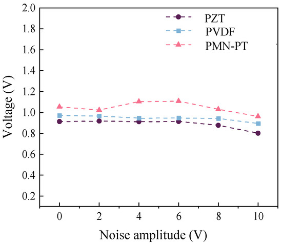 A comparison of the focused signal amplitudes for the three materials is shown in Figure 14. The data clearly show that PMN-PT yields better results compared to the other two materials. Through time-reversal processing, the results for all three materials significantly improved, with noticeable increases in voltage amplitude, demonstrating the time- and space-focusing capability of the time-reversal algorithm. In the experimental results, the difference between the response and focused signals for the three piezoelectric materials is relatively small, but their piezoelectric coefficients vary greatly. Theoretically, there should be a significant distinction between the peak values of the response and focused signals for the three materials. The reasons for this discrepancy may include the following: (1) PZT and PVDF are commercial sensors, and differences in wire soldering and silver polarization compared to the homemade sensors could account for significant variations. (2) The coupling between the piezoelectric materials and the steel plate during sensor attachment could also cause noticeable differences. However, the ranking of signal amplitudes aligns with the sequence of piezoelectric coefficients. In summary, PMN-PT piezoelectric composite materials exhibit superior noise reduction performance compared to PZT ceramics and PVDF films. Time-reversal technology significantly optimizes the received voltage amplitude, especially in noisy environments, demonstrating its effectiveness in improving signal quality. However, the effectiveness of the time-reversal algorithm in enhancing voltage amplitude decreases as the level of environmental noise increases.