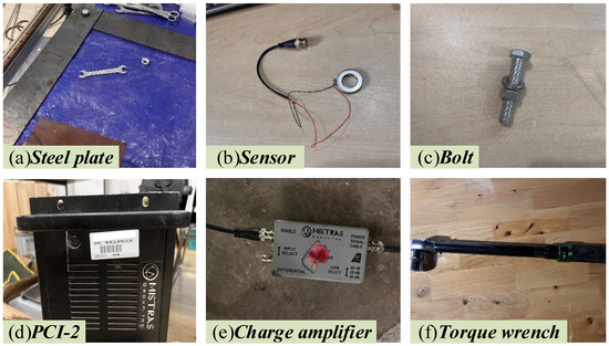 This section reports bolt preload experiments using the developed sensor system. The procedure involved adjusting bolt torque with a torque wrench, analyzing the relationship between preload variations and signal characteristics through received response signals and focused signal processing, deriving a fastening index via normalized data processing, and validating its accuracy through tests with unknown preload levels. Bolt preload refers to the axial force exerted between connected plates by the bolt-nut assembly. If the friction coefficient remains constant during torque application, the axial force shows a linear relationship with applied torque—higher torque corresponds to greater preload, thus enabling indirect preload assessment through torque measurements. The experimental workflow incrementally increased bolt torque while using ultrasonic techniques to monitor preload variations, thereby establishing correlations between preload levels and ultrasonic signal features. Material specifications and schematic diagrams are presented in Figure 15a–f and Figure 16.