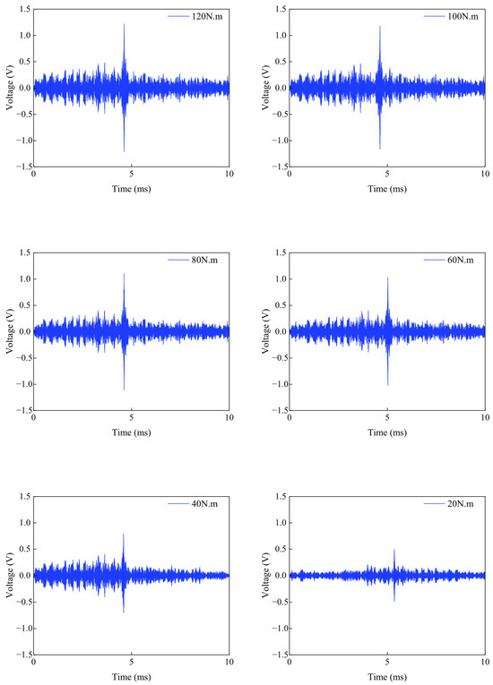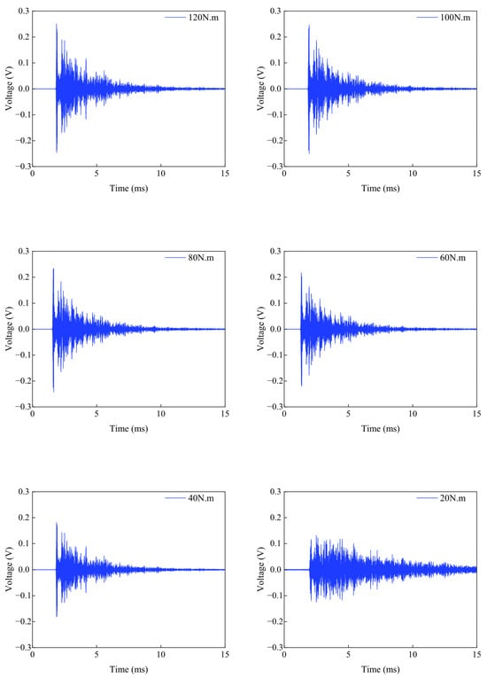 To validate the accuracy of the fastening index, experimental tests were conducted under six unknown preload conditions spanning the full operational range from fully loosened to fully tightened states. The validation process involved calculating the loosening index to estimate preload ranges, applying the differential method for preload quantification, and incrementally increasing torque using a calibrated torque wrench to obtain ground-truth measurements. Comparative analysis between calculated and measured preload values (Table 10) confirmed the method’s reliability, with representative response and focused signals illustrated in Figure 24 and Figure 25.
